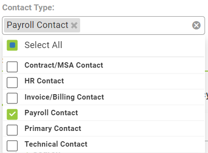 Select Payroll Contact from the dropdown list in the Contact Type field on the User Profiles screen for Business Partner users or Company Level users (not linked to a Business Partner) to receive PaySpace Newsletters, etc.