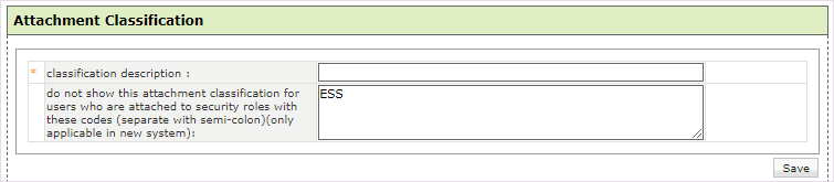 To exclude users from viewing a specific attachment or document that was uploaded, specify the Security Role Code whose users should not be able to view the attachment classification and save your changes.