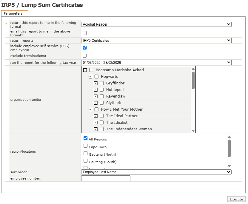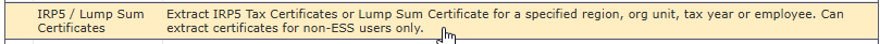 Navigate > Reports > Reports > Classic > Legislative > IRP5 / Lump Sum Certificates