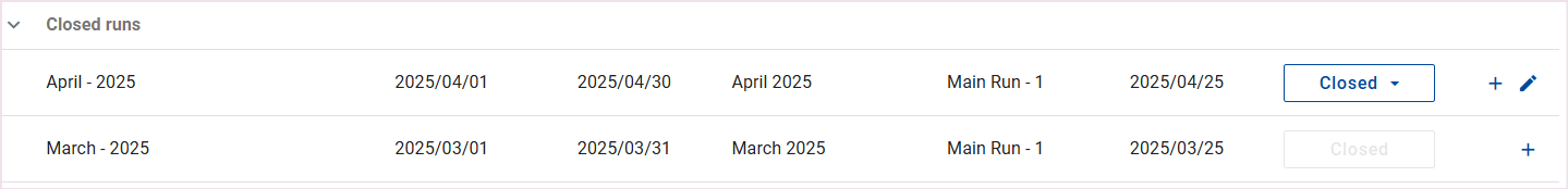 - Make sure all financial reports are saved before reopening a closed run, as recalculations may occur when the run is reopened or modified.