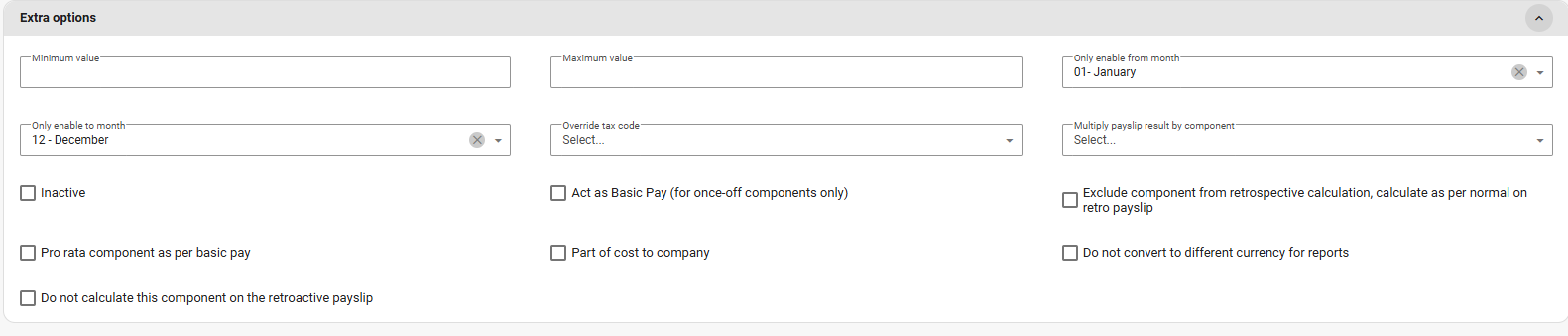 Once a component is created, users can override its tax code as necessary on the Payroll Component screen.