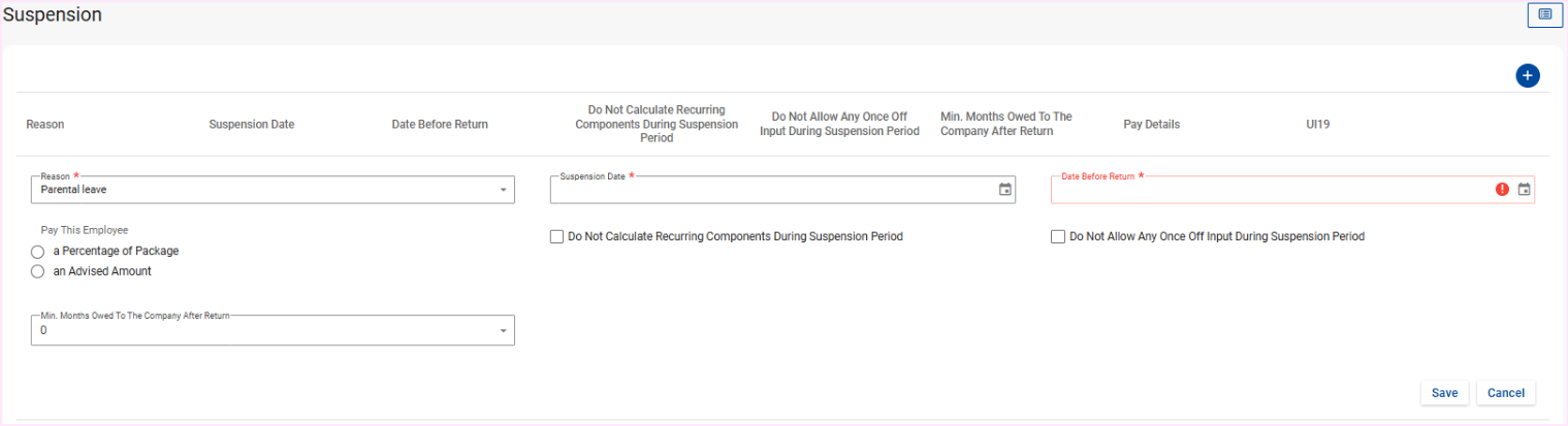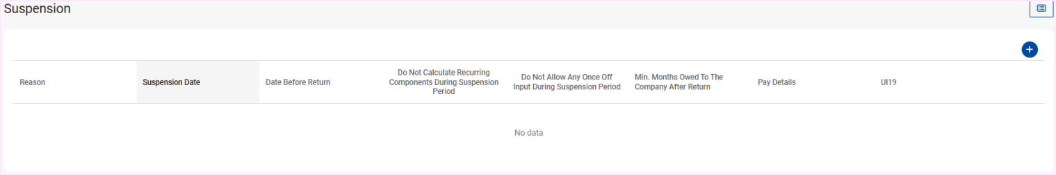 This applies to all PaySpace editions. An employee can be placed on suspension by creating a record on the Suspension screen. Navigate > Employee > On / Off Boarding > Suspension Step 1: Select the + Suspension button. Step 2: Configure the pop up ...