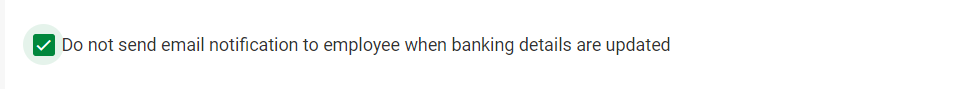 The system was enhanced to automatically notify employees if their banking details are updated. To prevent the notification from being sent, enable the "Do not send email notification to employee when banking details are updated" setting under the Employee Settings section on the General Settings screen..