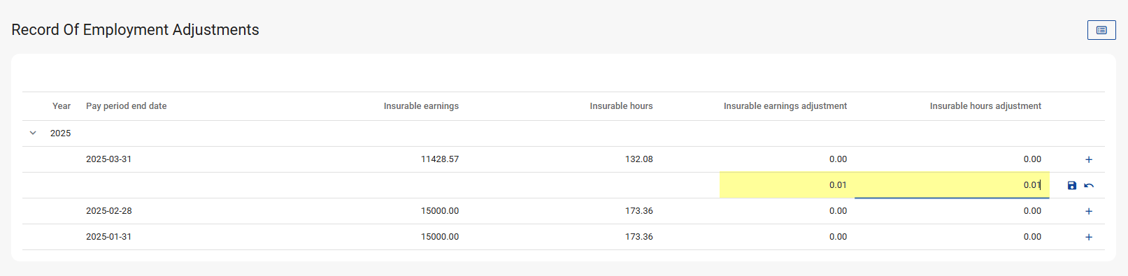 The Insurable Earnings and Hours can be modified by creating an adjustment on the employee's Record of Employment Adjustment screen.