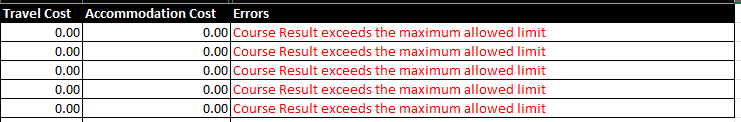 To resolve the error "Course Result exceeds the maximum allowed limit" when completing employees' Training Records via the Bulk Actions screen, remove any zero values entered in the Travel Cost and Accommodation columns, then retry the bulk upload.