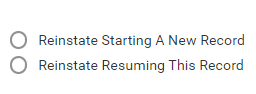 When should an employee be reinstated Starting A New Record or Resuming This Record?