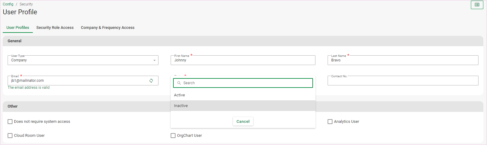 A company level user's status can be made Inactive on the User Profiles screen, to remove system access.