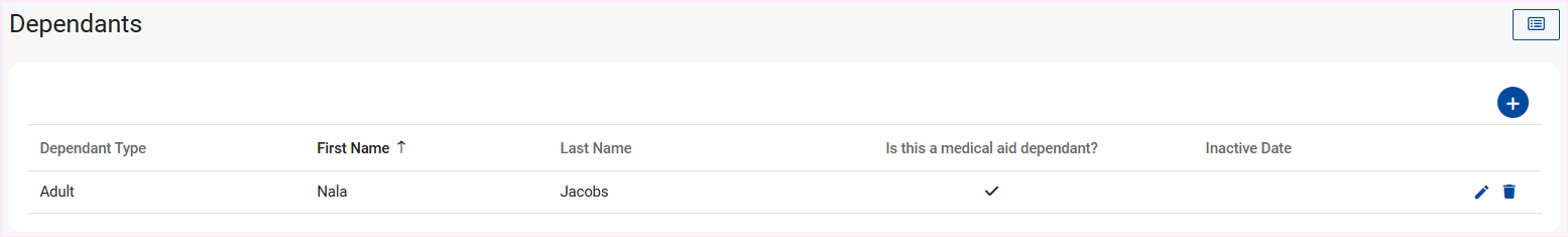 To delete a medical aid dependant from an employee's Dependants screen, click on the "Delete" icon on the right of the dependent in question.