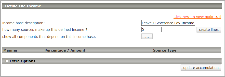 To remove a component's defined income, change the number captured in the "how many sources make up this defined income ?" field to 0 and select the "create lines" and "update accumulation" buttons respectively.