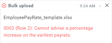 The "Cannot advise a percentage increase on the earliest payrate" error will display when the "Percentage (%) Increase of Previous Rate" column (H), has been completed for the affected employee, and the record being captured is their first record.