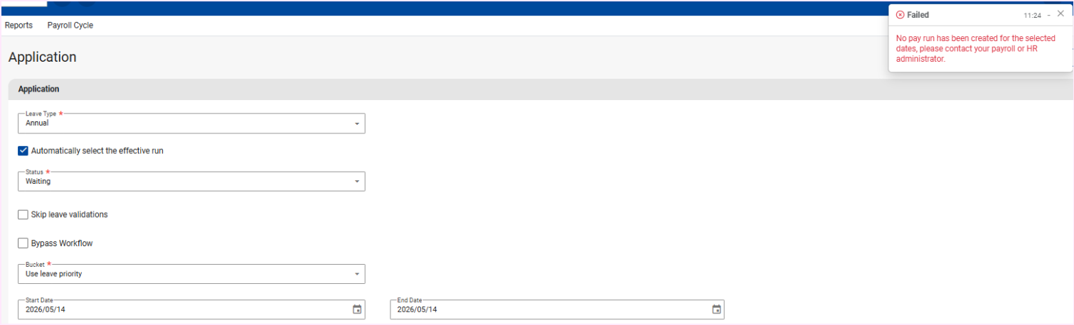 How do I resolve the error: "No pay run has been created for the selected dates, please contact your payroll or HR administrator." when applying for future dated leave?
