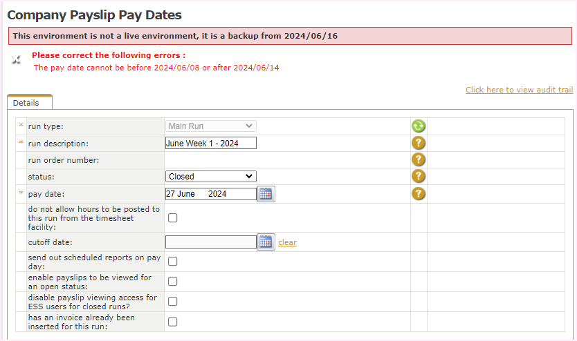 Pay dates are not allowed to fall on bank holidays in the UK. If a user edits a pay date to fall on a bank holiday, the following run validation error will appear: “The pay date cannot be on a bank holiday”. Navigate > Payroll Cycle > Payslip Pay ...