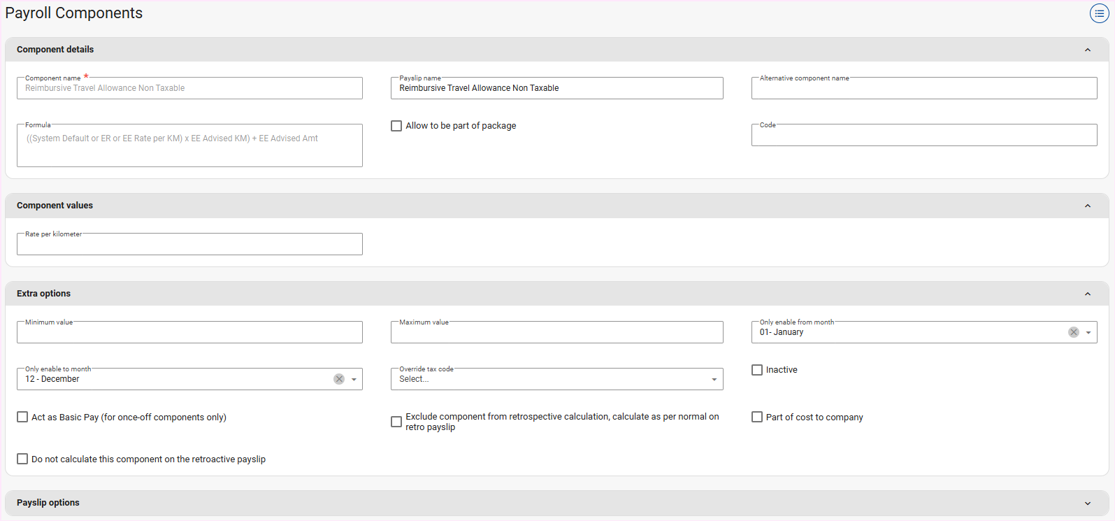 When adding the taxable or non-taxable Reimbursive Travel Allowance component to an employee's payslip, the "Reimbursive Travel allowance requires a rate per km" payslip error is a result of a 0.00 value in the "Rate per kilometer" field when configuring the Reimbursive Travel Allowance Non Taxable or Reimbursive Travel Allowance Taxable component on company level.