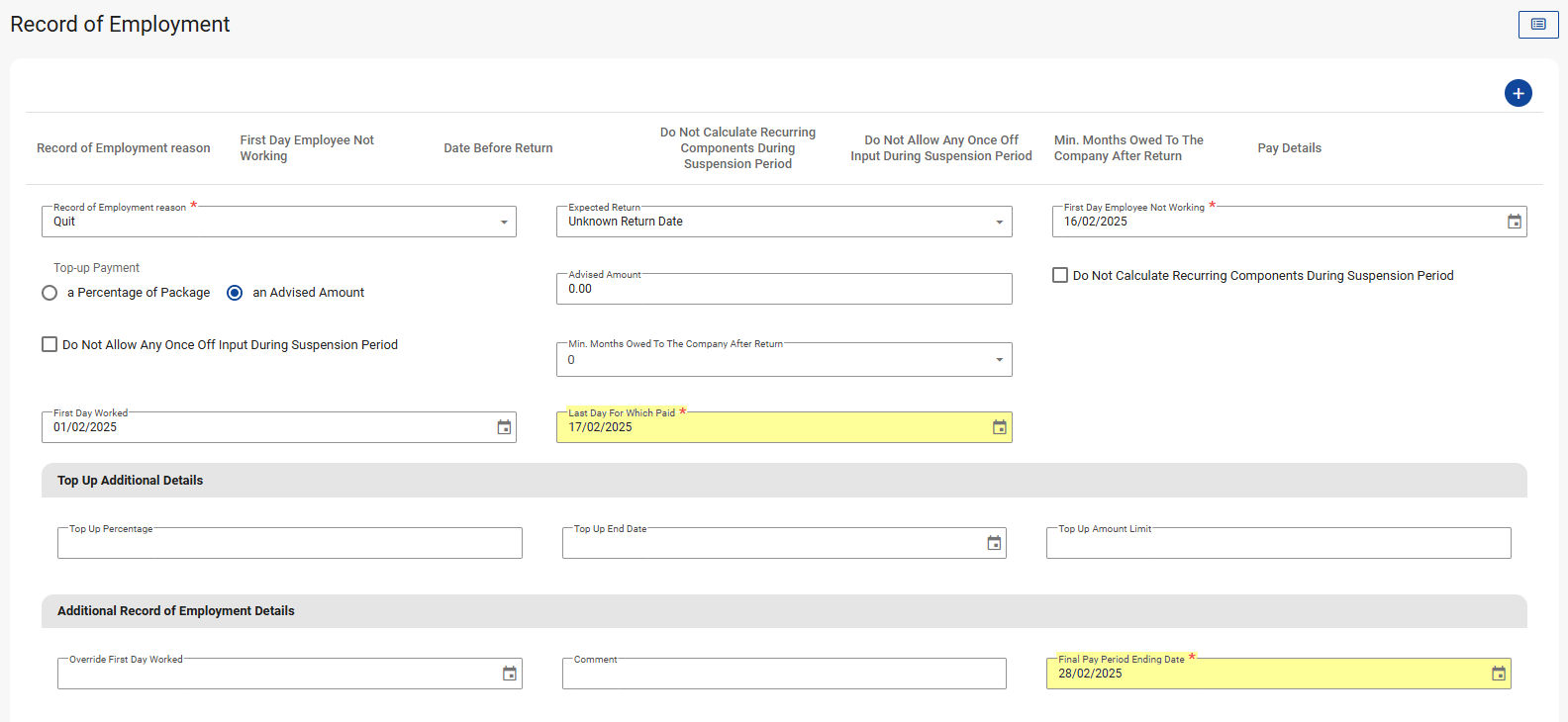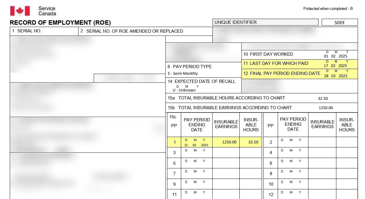 The Record of Employment will need to be corrected by updating the "Final Pay Period Ending Date" to correspond with the Pay Period Ending Date. If the "Last Day For Which Paid" is later than the Pay Period Ending Date, it will also need to be updated to correspond with the Pay Period Ending Date.