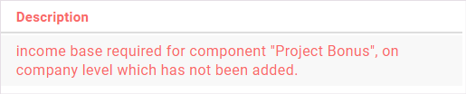 The run error "Income base required for component" will display when the income base for the referenced component has not been configured.