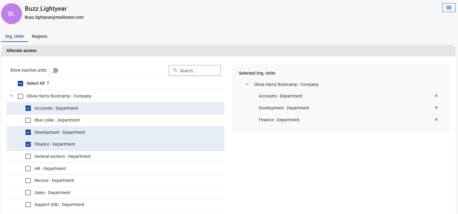The User Org. Unit Permissions screen allows you to specify which employees the user will have access to on Organisation Unit and/or Region level.