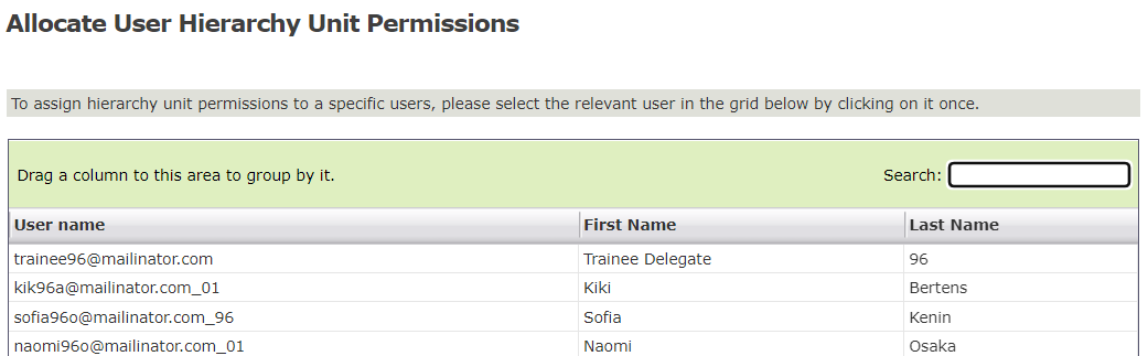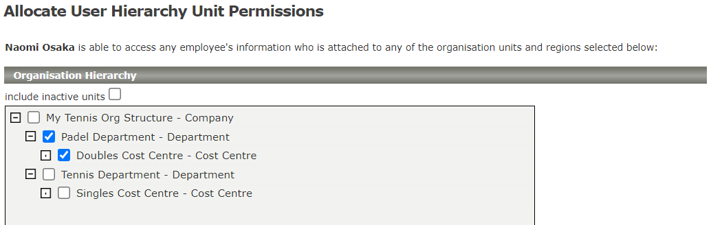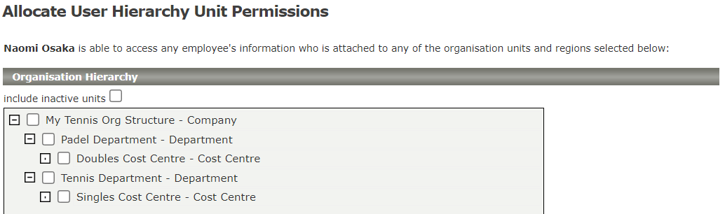 The User Org. Unit Permissions screen allows you to specify which employees the user will have access to on Organisation Unit or Region level.