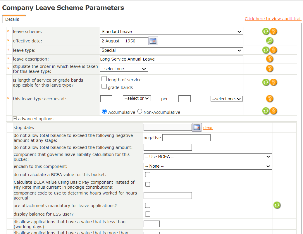 Make use of the following steps and complete the rest of the Leave Scheme Parameters screen according to your company's leave policy regarding Long Service Annual Leave and save your changes.