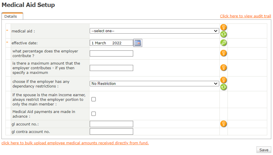 - If the company contributes towards the Medical Aid scheme, ensure that the percentage is recorded on this screen.