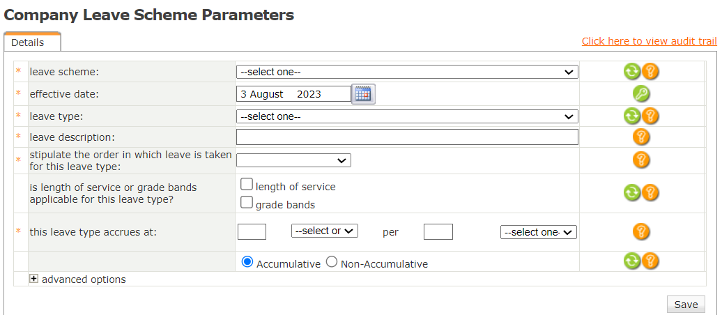 This feature is available on all PaySpace editions. Once a Leave Scheme is created, leave buckets can be created and linked to it on the Leave Scheme Parameters screen. Read each field's description carefully, to discern what information is required ...