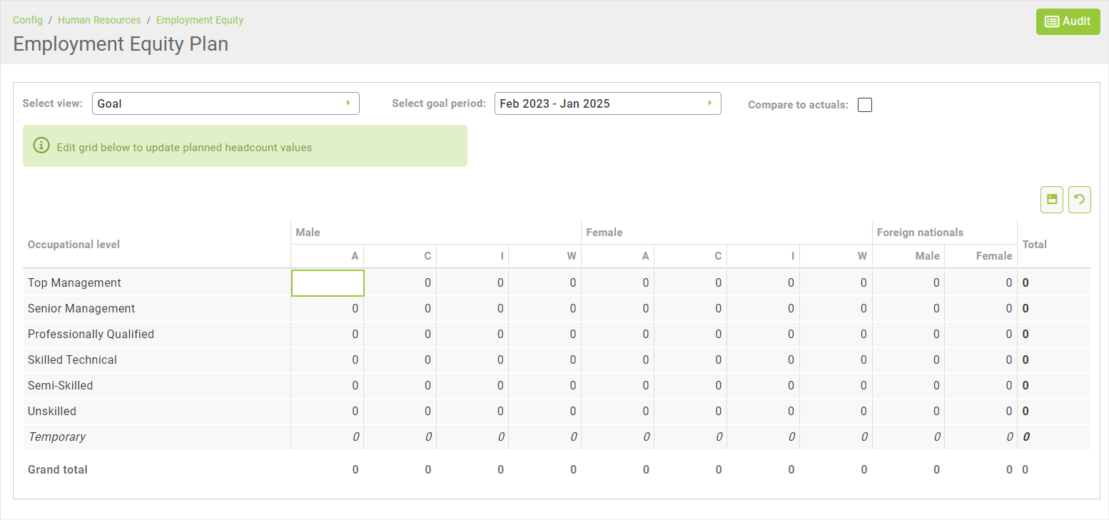 Step 4: Select the Goal Period and then proceed to edit the grid and select the file icon to save your changes to the employment equity plan.
