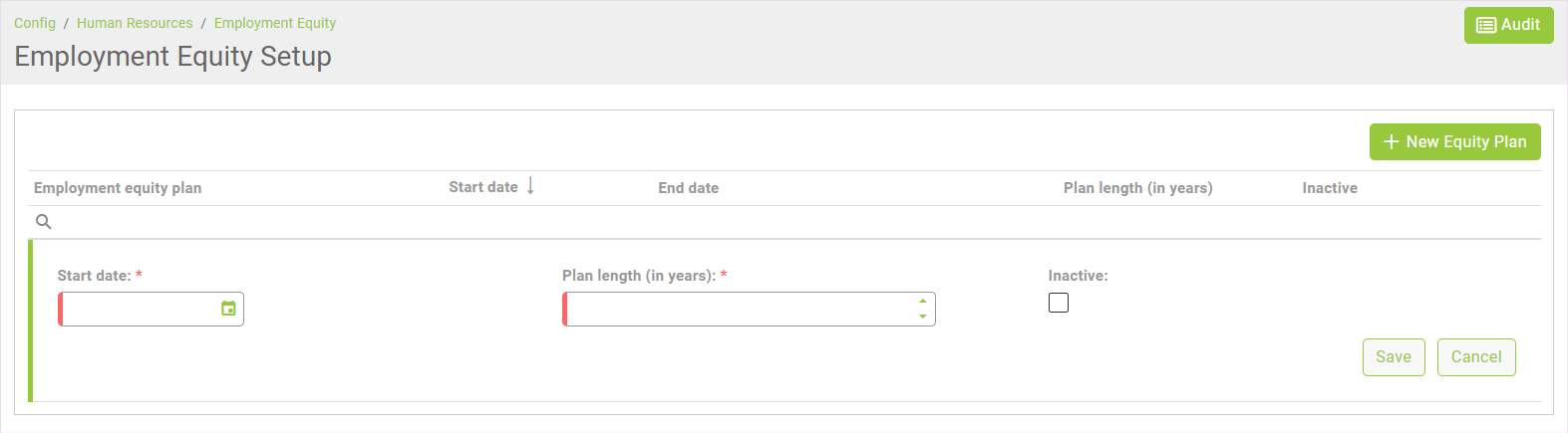 Step 1: Select the option + New Equity Plan to create a new employment equity plan.