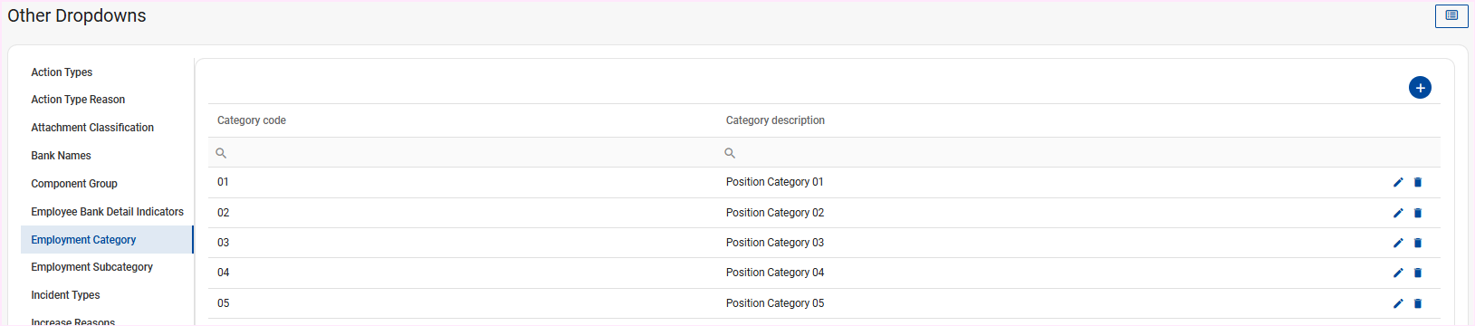 Navigate > Config > Basic Settings > Drop Down Management > Other Drop Downs > Employment Category