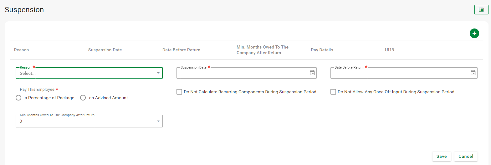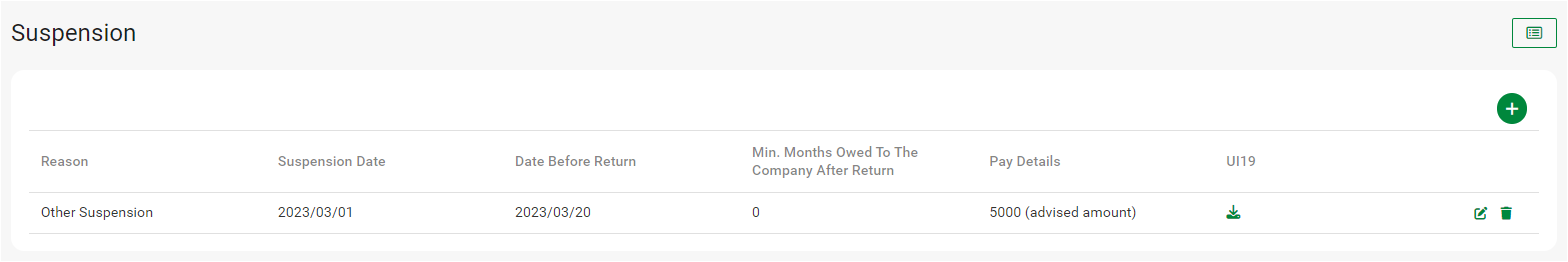 An employee can be placed on suspension by creating a record on the Suspension screen.