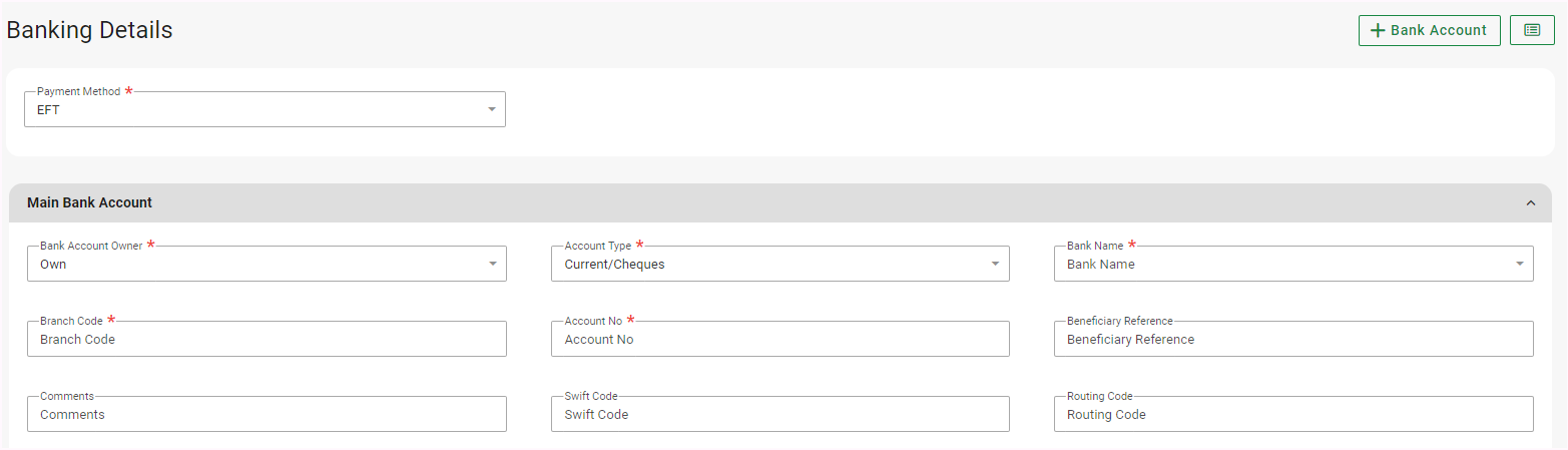 An employee's banking details can be updated by editing the existing information in the mandatory fields on their Banking Details screen.