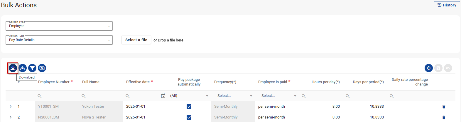 An employee's current Pay Rate record can be edited via Bulk Actions by downloading the populated spreadsheet, making the necessary changes, and uploading the sheet. This will allow you to make changes to the current Pay rate record without receiving the "Effective date must be unique to each record" error.