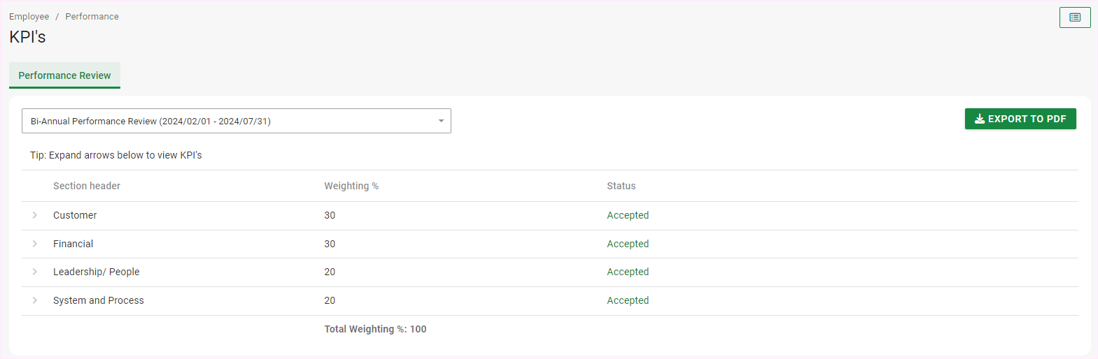 This feature is available on the Premier and Master payroll edition. The error "This sections KPI's do not equal 100%" will display because the KPI on the Template Section does not equal 100%. Navigate > Configuration > Human Resources > Performance ...
