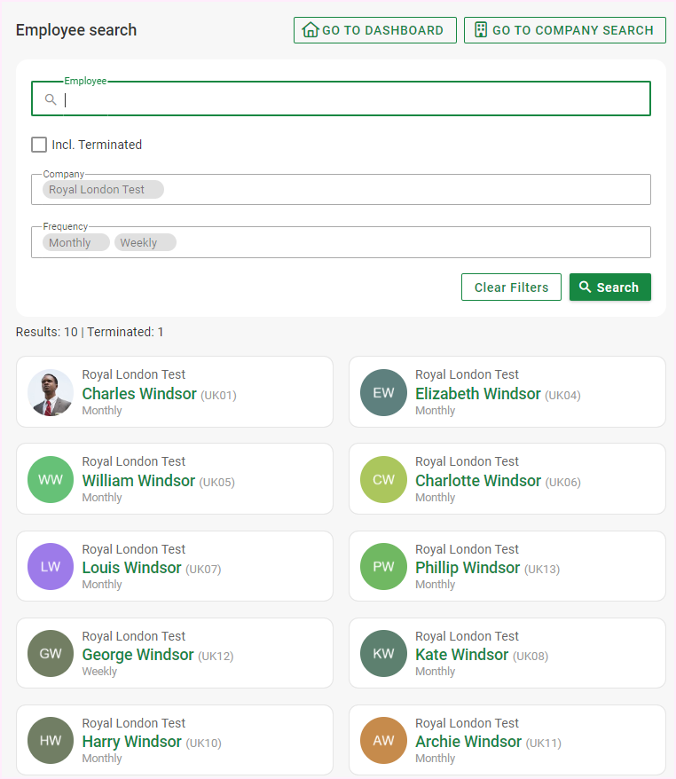 The Employee Search feature (person icon) is used to search for employees in/within a company/group that a company level user has been granted access.