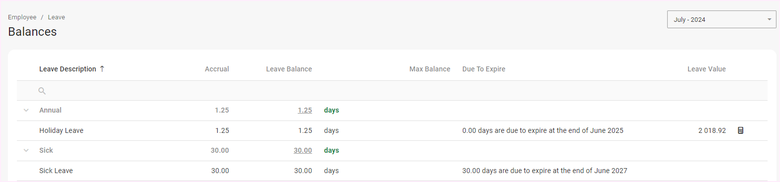 The Balances screen stores an employee's leave balance per leave type. Each leave type section can be expanded to view its balance and other related information.