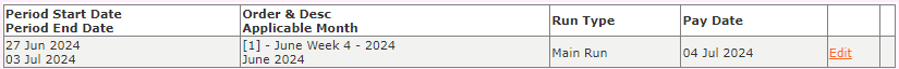 The pay date can be viewed on the company Payslip Pay Dates screen.