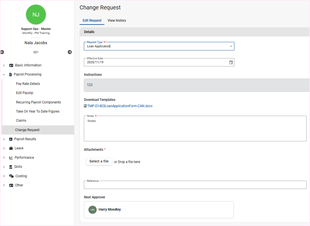 An employee change request refers to a formal request made by an employee to initiate a change in their employment details or circumstances within the company. This request can pertain to various aspects of their employment. This feature can be used to configure request types that are not built into the system or to allow employees to request a change without permitting them to make the change themselves for security purposes.