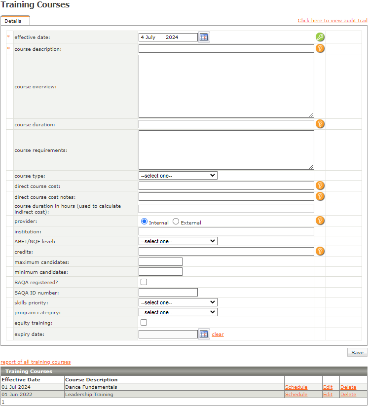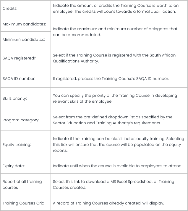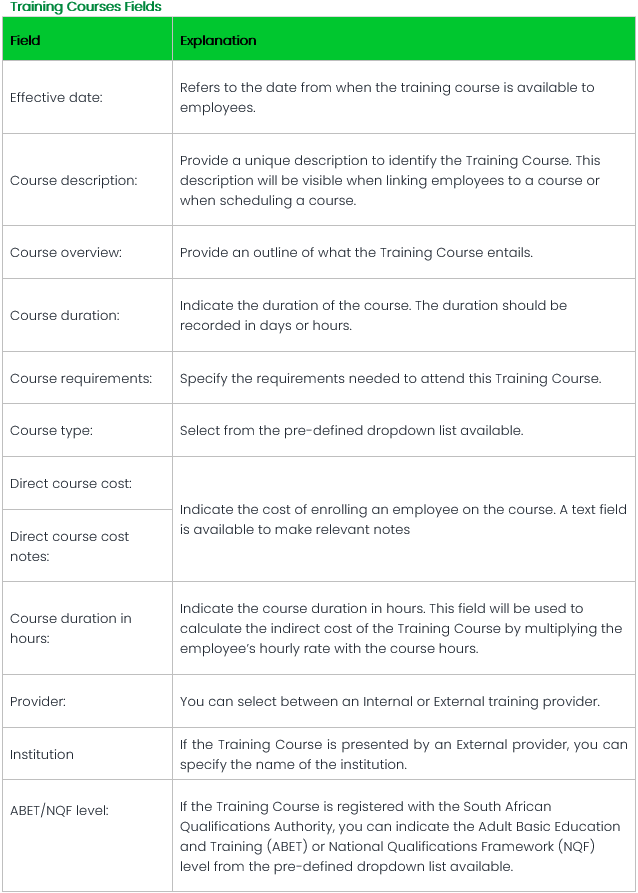 This feature is available on the Premier and Master edition All training courses need to be created on company level before they can be captured on employee or position level. Navigate > Configuration > Human Resources > Upskilling > Training Courses
