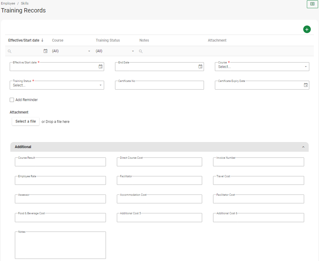 Besides allowing employees to enrol to scheduled Training Courses, you can also add a Training Course directly on the Employee Training Record Screen.
