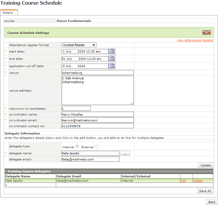 Once a Training Course has been added, it can be scheduled from the Company Training Courses Screen to allow delegates to enrol.