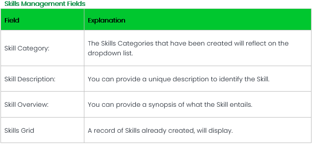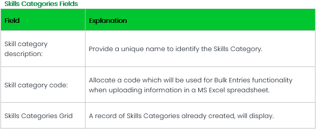 Defining Skills Categories allows you to group skills for reporting purposes. Adding Skills Categories will also enable you to allocate weightings to a category. Before individual skills can be created, you need to define Skills Categories.
