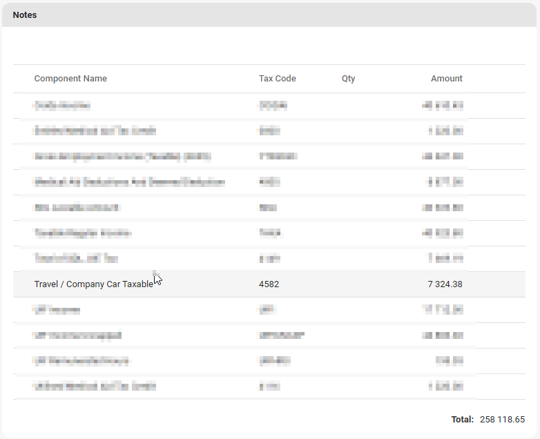 If a component includes a taxable portion, it will be stored in the Notes section of the payslip. (For example, the tax portion of the Company Car - Use of motor vehicle acquired by employer NOT via Operating Lease Vat company contribution component)