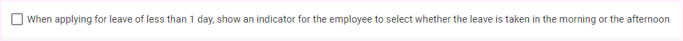 To allow employees to specify the time of day they will be on leave, enable the "When applying for leave of less than 1 day, show an indicator for the employee to select whether the leave is taken in the morning or the afternoon" checkbox under the Employee self service section on the Leave Settings screen.
