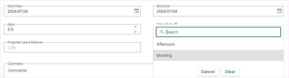 When enabled, a new field will appear when applying for leave and changing the number of days to less than a day. The option selected here will also show in the workflow for the approvers to see.