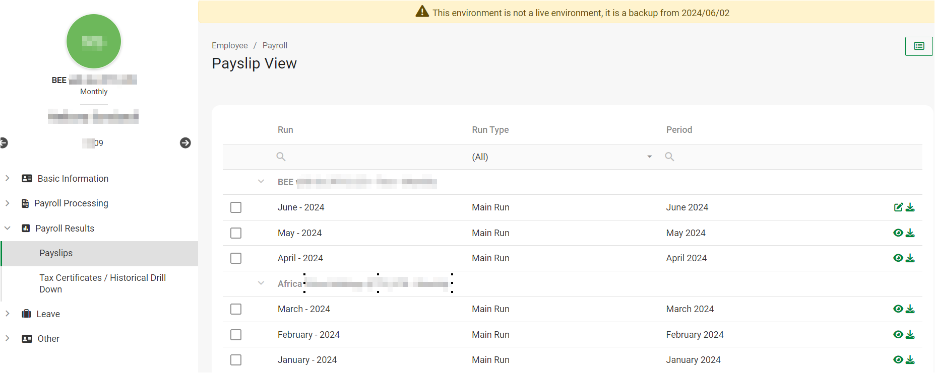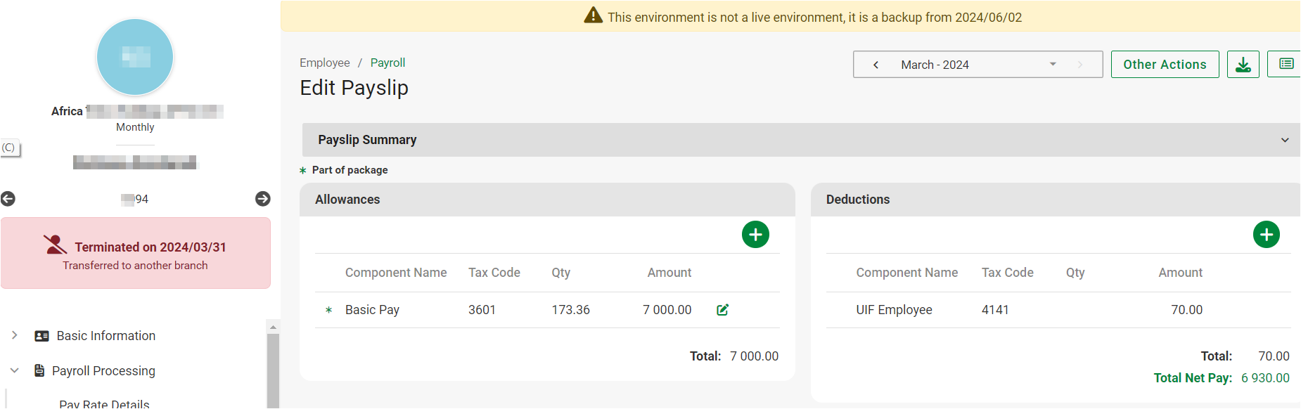However, the moment it is accessed, the system will redirect the user to the old profile in which the payslip can be edited if the specific run is open (for example, an employee is terminated in Africa and is transferred to BEE, and their Africa March payslips needs to be edited).