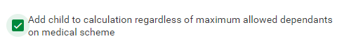 In specific scenarios, enable the "Add child to calculation regardless of maximum allowed dependants on medical scheme:" checkbox should an additional dependent be included in the calculation, however, the system will limit the calc on the component should the maximum limit be reached.
