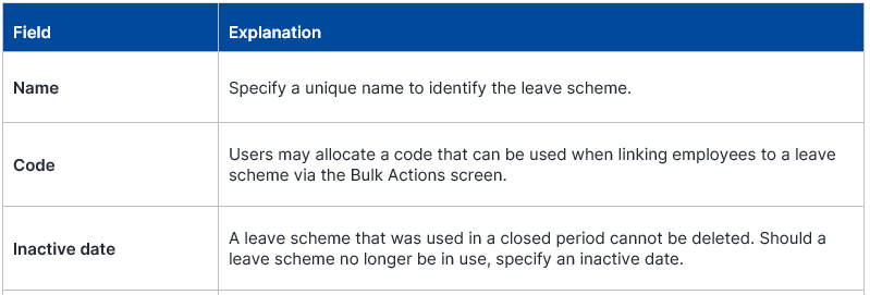 This feature is available on all PaySpace editions. Once a Leave Scheme is created, leave buckets can be created and linked to it on the Leave Scheme Parameters screen. Read each field's description carefully, to discern what information is required ...