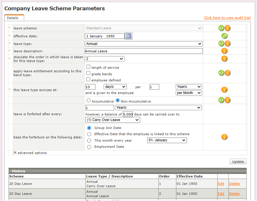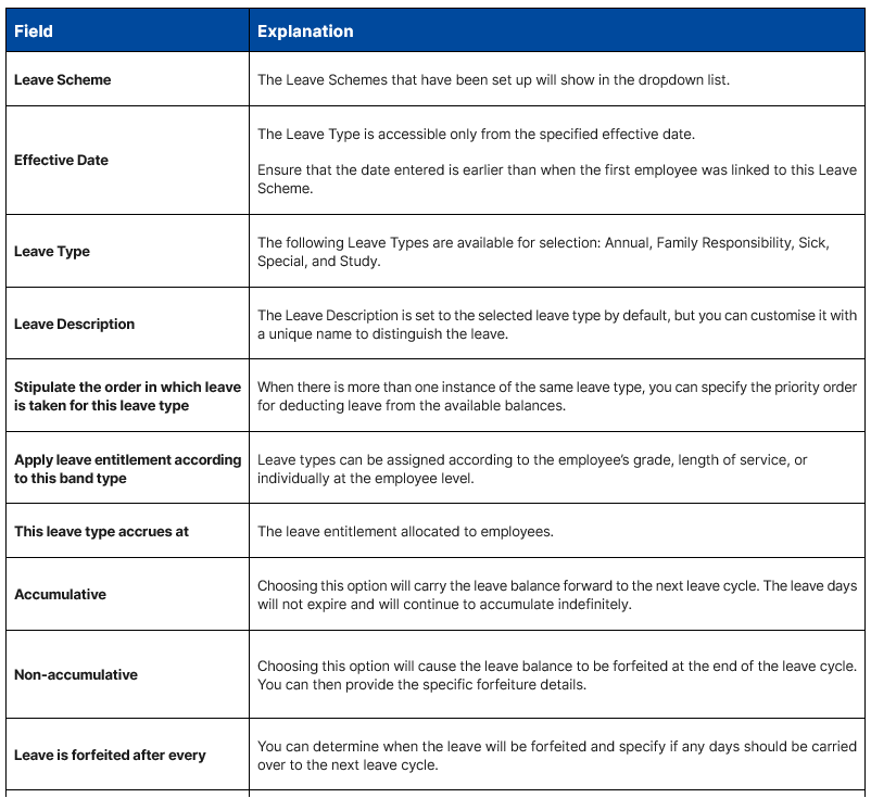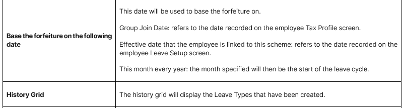 Once you have created the Leave Scheme, the types of leave available in the Leave Scheme should be defined on the Leave Scheme Parameters Screen.