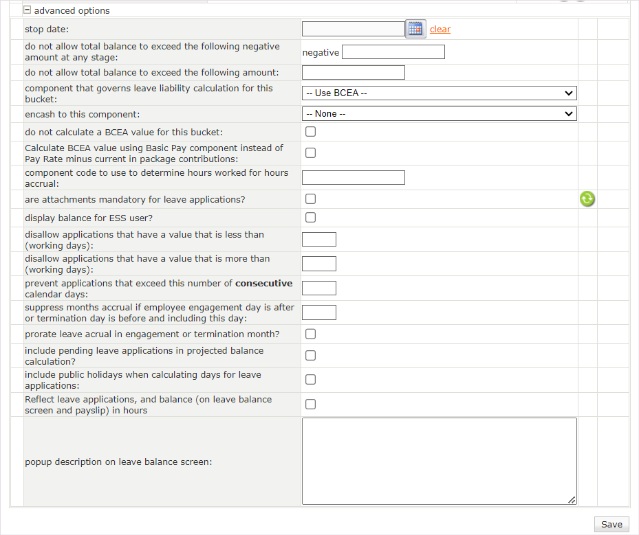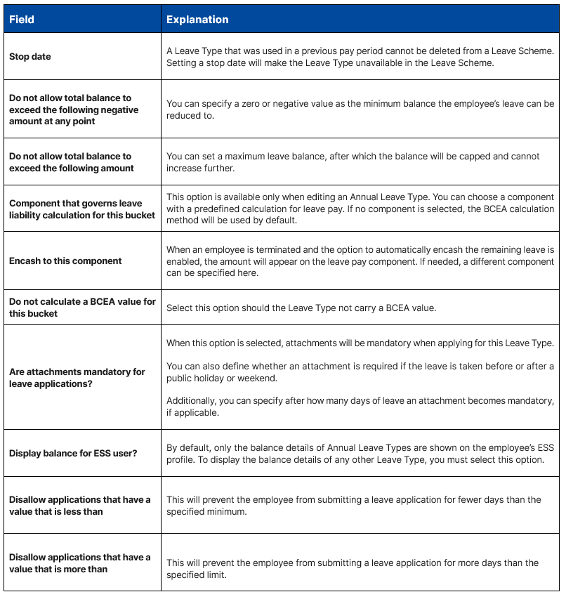 This feature is available on all PaySpace editions. Once a Leave Scheme is created, leave buckets can be created and linked to it on the Leave Scheme Parameters screen. Read each field's description carefully, to discern what information is required ...