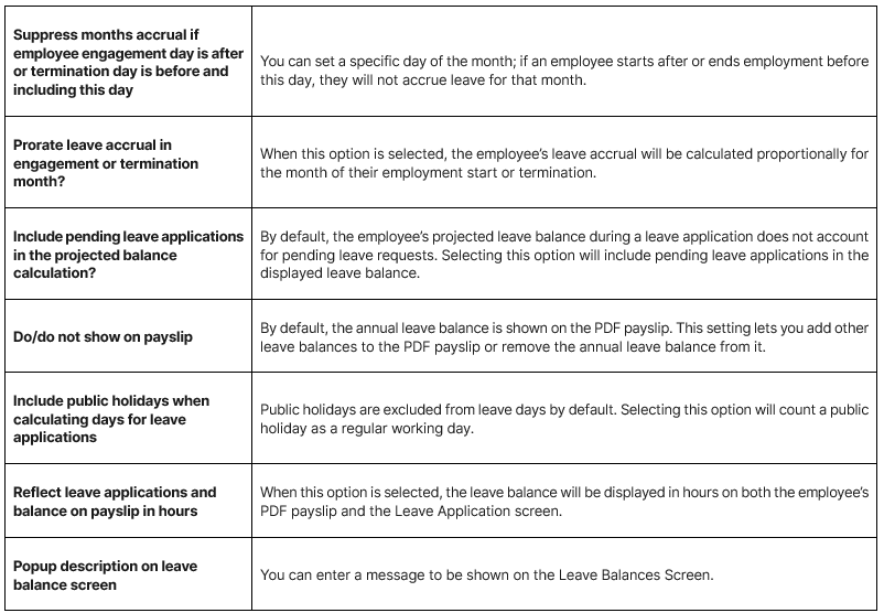 In addition to updating the available fields when adding a Leave Type, there are extra options to customise the Leave Type according to the company’s leave policy.