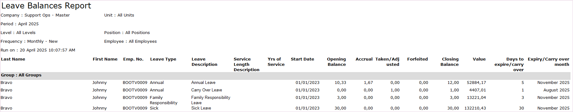 To extract a listing of the employees’ opening and closing balances, accrual days, days taken or adjusted, as well as the value of the employees’ leave, print the Leave Balances Report.