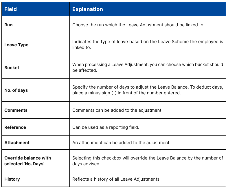 - Where you have neglected to link an employee to a leave scheme and do so after a period, you can process a leave adjustment to correct the employee’s leave balances. The system will not adjust the leave balances automatically.